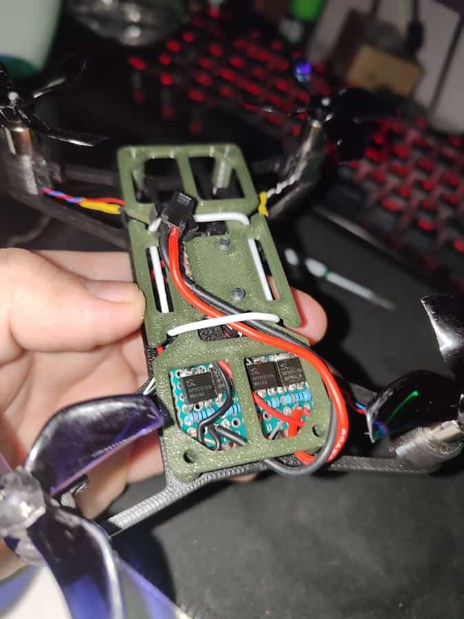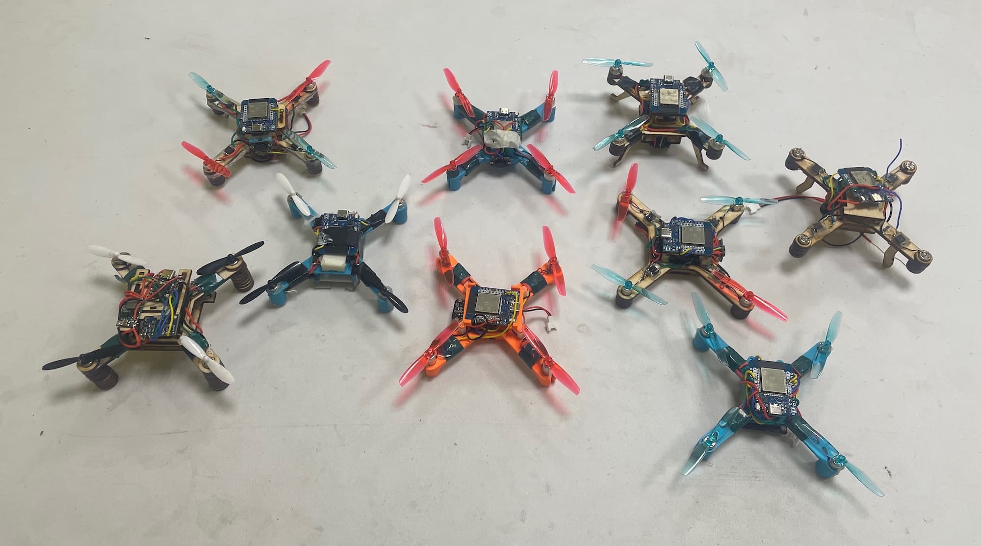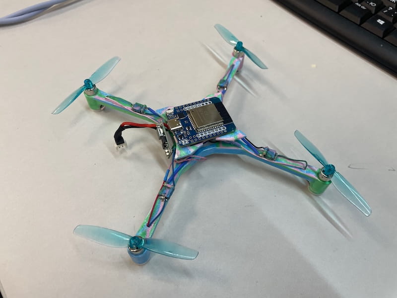 Description: 3D-printed and wooden frames, ESP32 Mini, DC-DC buck-boost converters. BetaFPV LiteRadio 3 to control the drones via Wi-Fi connection.