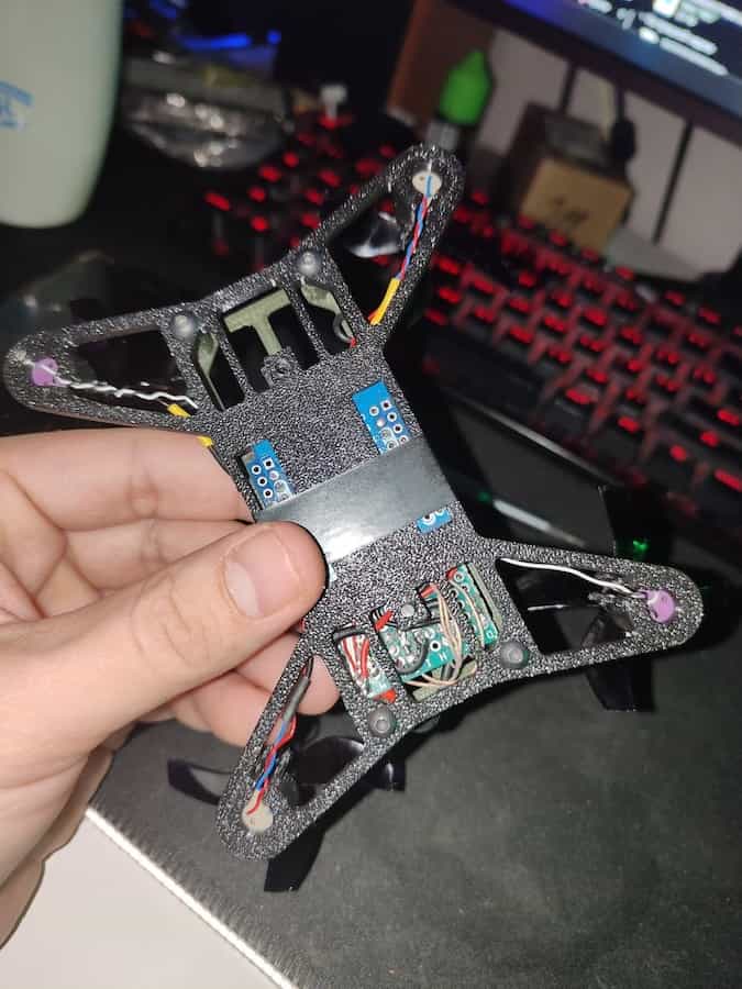 Features: SpeedyBee BLS 35A Mini V2 ESC, ESP32-S3 board, EMAX ECO 2 2207 1700kv motors, ICM20948V2 IMU, INA226 power monitor and Bluetooth gamepad for control.