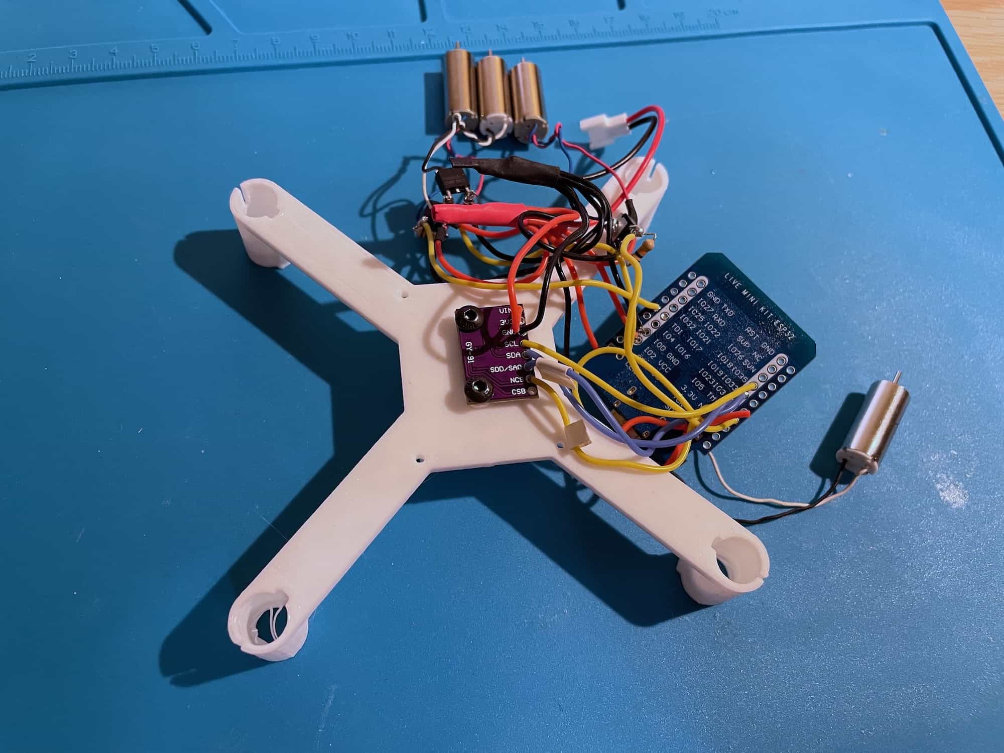 > The drone above is an early build, and it has **inversed** motor directions scheme. The photos only illustrate the assembly process in general.