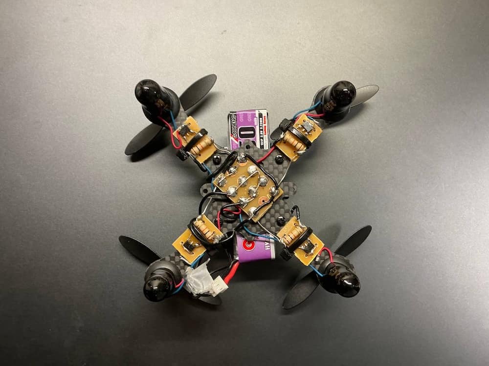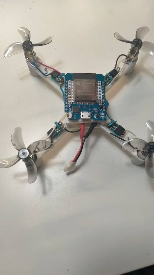 Description: 3D-printed and wooden frames, ESP32 Mini, DC-DC buck-boost converters. BetaFPV LiteRadio 3 to control the drones via Wi-Fi connection.