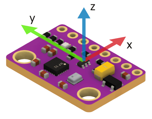 The drone has *X* axis pointing forward, *Y* axis pointing left, and *Z* axis pointing up, and the supported IMU boards have *X* axis pointing to the pins side and *Z* axis pointing up from the component side: