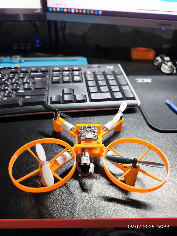 Description: 3D-printed and wooden frames, ESP32 Mini, DC-DC buck-boost converters. BetaFPV LiteRadio 3 to control the drones via Wi-Fi connection.